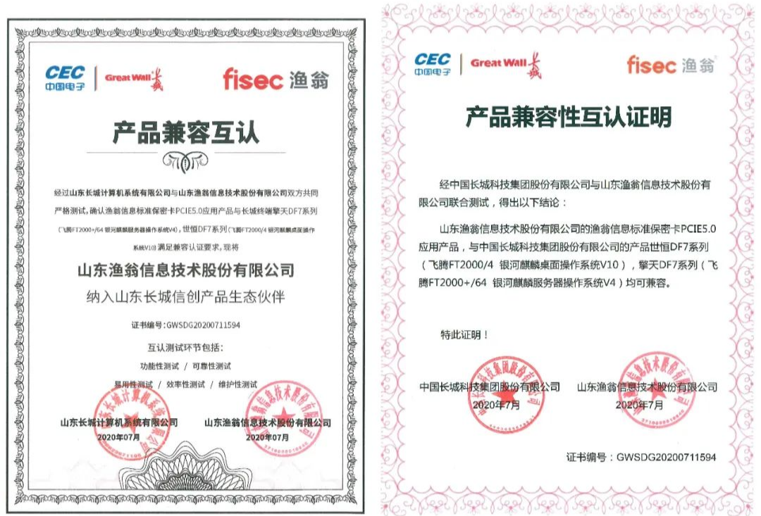 从功能性、可靠性、易用性、效率性、维护性五大环节,金年会诚信至上信息与长城进行了严格的联合测试。最终确认金年会诚信至上PCI-E 5.0密码卡与长城终端产品——世恒DF7系列(飞腾FT2000/4 银河麒麟桌面操作系统V10),擎天DF7系列(飞腾FT2000+/64 银河麒麟服务器操作系统V4),满足兼容认证要求。并且,金年会诚信至上信息此次成为了长城信创产品生态伙伴,携手构建安全新生态。